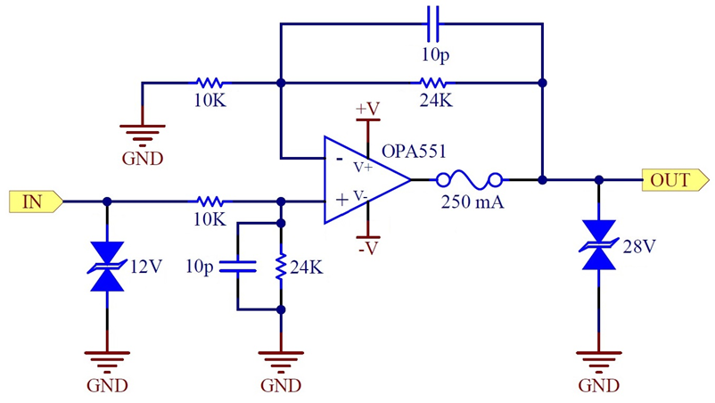 Figure 2 shows the simplified schematic of the gain applied to the Analog Outputs with the Analog Output card.