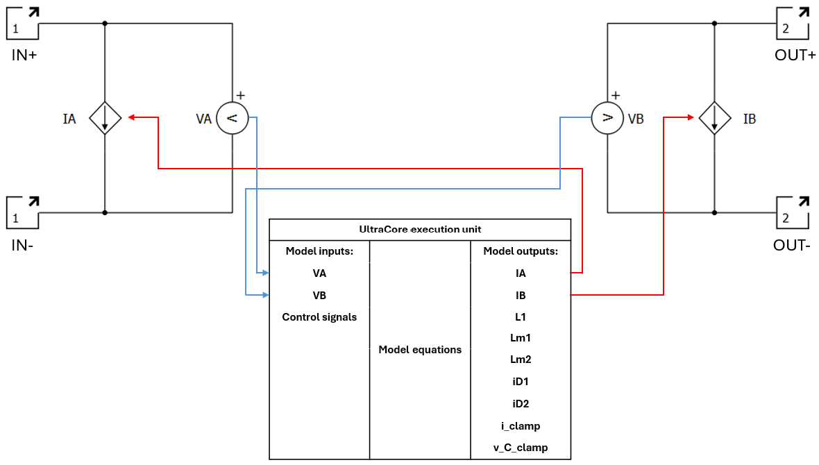If UltraCore is selected as the solver platform, the component will contain an interfacing electrical circuit towards the rest of the circuit, as described in Electrical circuit interface. The Active Clamp Forward-Flyback component in the Typhoon HIL Schematic Editor Library uses the current source interface. The interface is formulated in such a way that the voltages are inputs to the dedicated UltraCore, while the currents are its outputs. Figure 2 shows the circuit interface of the Active Clamp Forward-Flyback comoponent.
