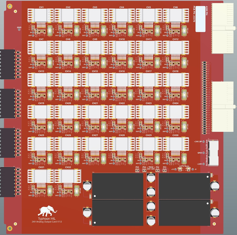 The 24V Analog Output card amplifies the analog signal voltage of HIL Simulator devices from ±10V to ±24V, by applying a gain factor of 2.4.