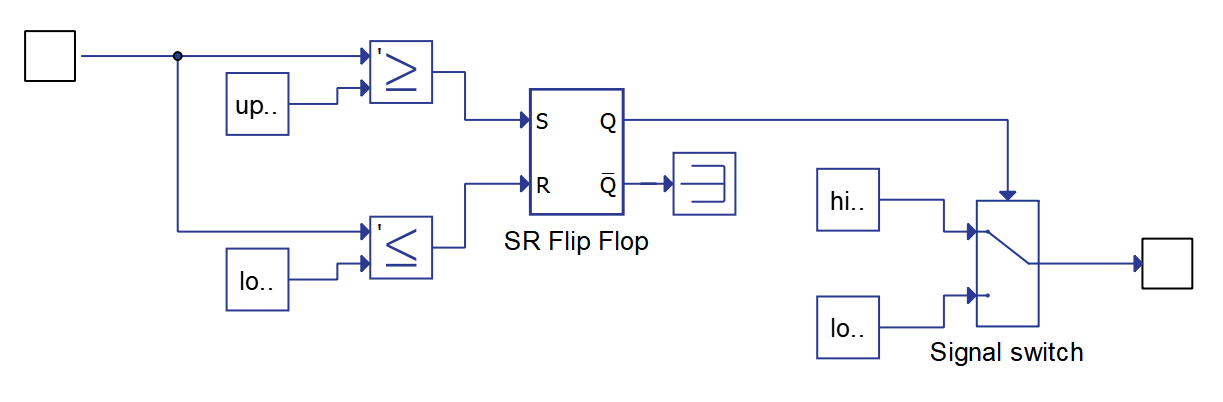 If the input signal is higher than the Upper threshold value, the output is High output value. If the input signal is lower than the Lower threshold value, the output is Low output value. If the signal is in between these values, the output does not change.