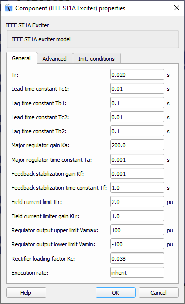 Description of the IEEE ST1A Exciter component in Schematic Editor, which represents systems in which the excitation power is supplied through a transformer from the generator terminals and is regulated by a controlled rectifier.