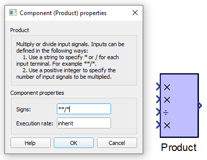 If the signal is connected to the “÷” terminal, its value will be converted to reciprocal value (1/in). If the signal is connected to the “x” terminal, its value will remain unchanged.