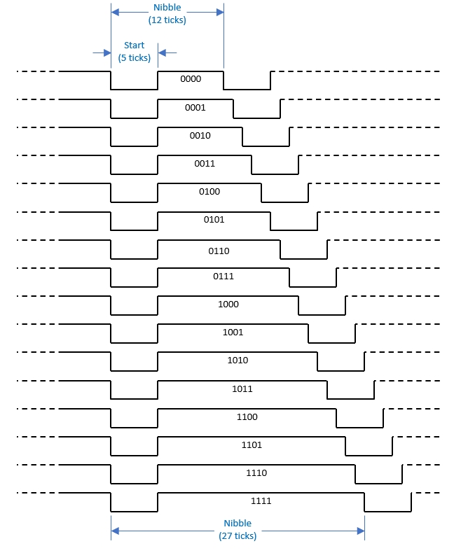 - Each nibble is encoded as a pulse width in the range of 12 to 27 ticks.