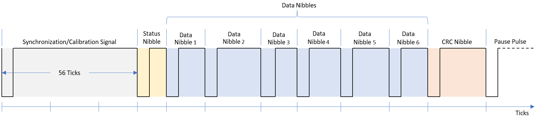 To enable this communication, the protocol relies on the concept of a tick, the fundamental time unit used for encoding and decoding data. Each data nibble (4 bits) is represented by a pulse width, with a fixed low time and a variable pulse length that encodes the nibble value. Different pulse lengths correspond to different nibble values, where one data nibble can represent numbers in the range 0–15.