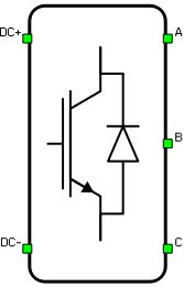 Selecting Model as the Control parameter, enables IGBT gate drive signals to be set up directly from the signal processing model. The input pin gates appears on the component and requires a vector input of twelve gate drive signals in the following order: [Phase A S1, Phase A S2, Phase A S3, Phase A S4, Phase B S1, Phase B S2, Phase B S3, Phase B S4, Phase C S1, Phase C S2, Phase C S3, Phase C S4]. When controlled from the model, logic is always active high.
