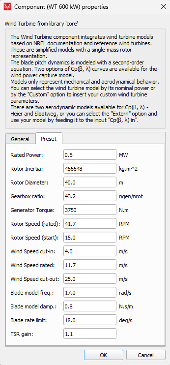 Considering that these are simplified models, the Wind Turbine Power curve will be slightly different from that obtained in a specialized CAE, like NREL OpenFAST, and the model is intended to be used in the normal operating range of wind speed and rotor speed. Therefore, the required computational effort is significantly lower than required for a detailed model simulation.