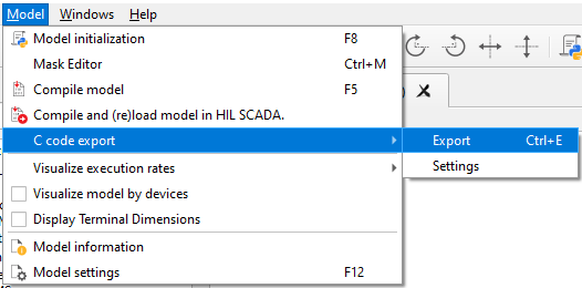 - Model menu (Model → C code export → Export) - see Figure 1 ,