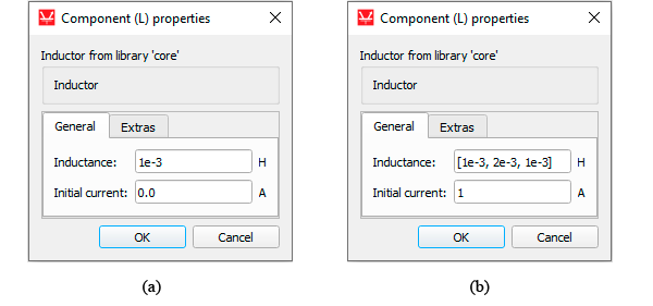 The values of the properties of those new inductors depend on how the original vectorized inductor was defined. Consider the example in Figure 2. All properties in (a) are defined as scalars, while the Inductance property in (b) is defined as a vector (Python list). In case (a), the inductor will be vectorized only if connected to a bus (it also inherits the bus size), and the resulting scalar inductors will have their properties equal to the original inductor. In case (b), the three resulting inductors have their Inductance property set as 1e-3, 2e-3, and 1e-3 (in order), and their Initial current as 1.