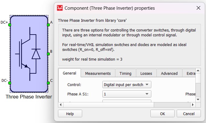 As a component's property with a specific real-time/VHIL context requirement example, we will use Losses calculation property of the Three Phase Inverter component.