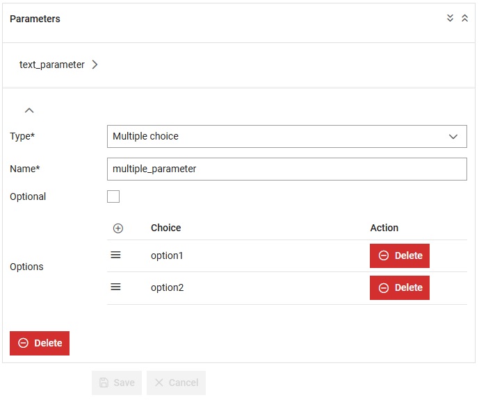 For a multiple choice parameter, options can be added by clicking on the add option button