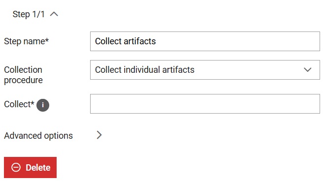 Artifacts can be collected using one of two following procedures, selectable from the Collect Artifact job step form: