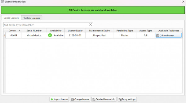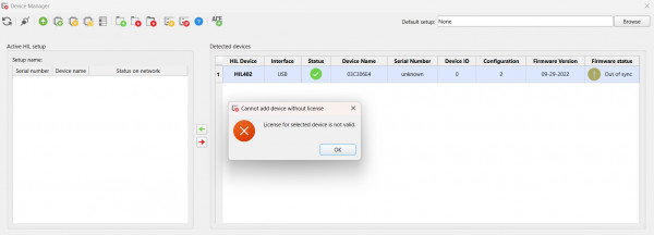 My university (Universitat Rovira i Virgili) has an available HIL 402 (details as the serial number provided) that, as you can see in the first attached picture, is detected by my pc but when I try to add the device to my setup, it clearly says that the license for selected device is not valid.