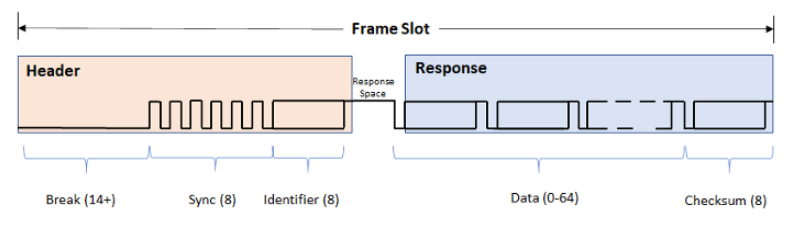 A LIN frame consists of a header and a response part. To initiate the LIN bus communication with a slave, the Master sends the header part. If the Master wants to send data to the Slave, it goes on sending the response part. If the Master requests data from the Slave, the Slave sends the response part.