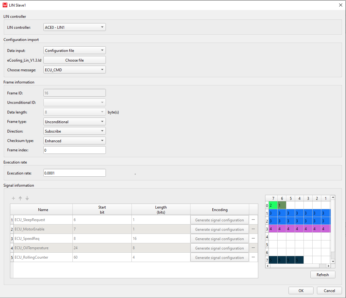 LIN Slave component can import LDF files to define the frames. The principle is the same for both publishing and subscribing frames and it will be demonstrated only on the subscribing LIN frame.